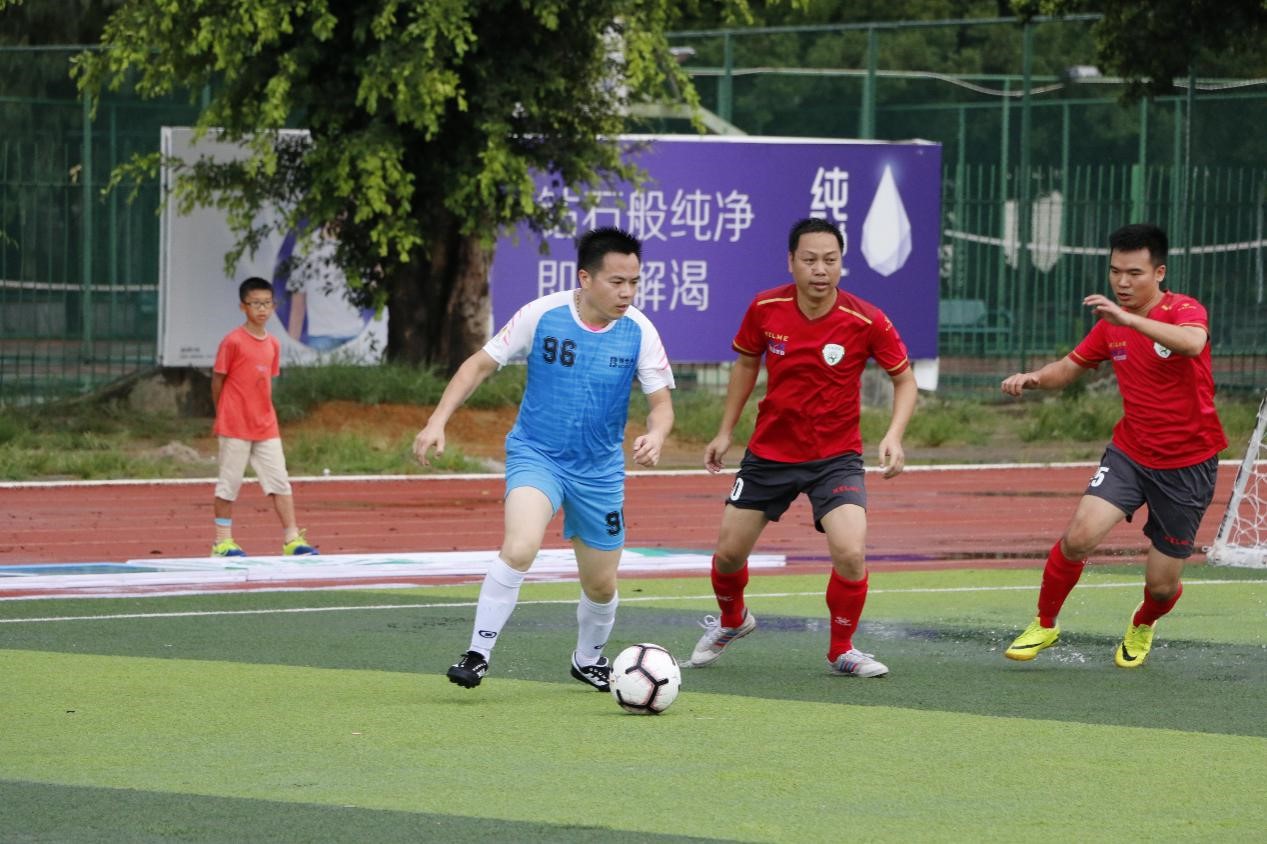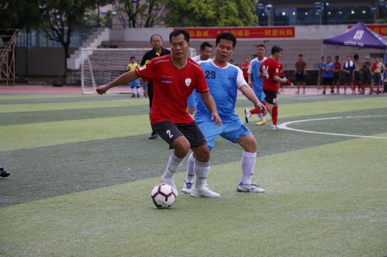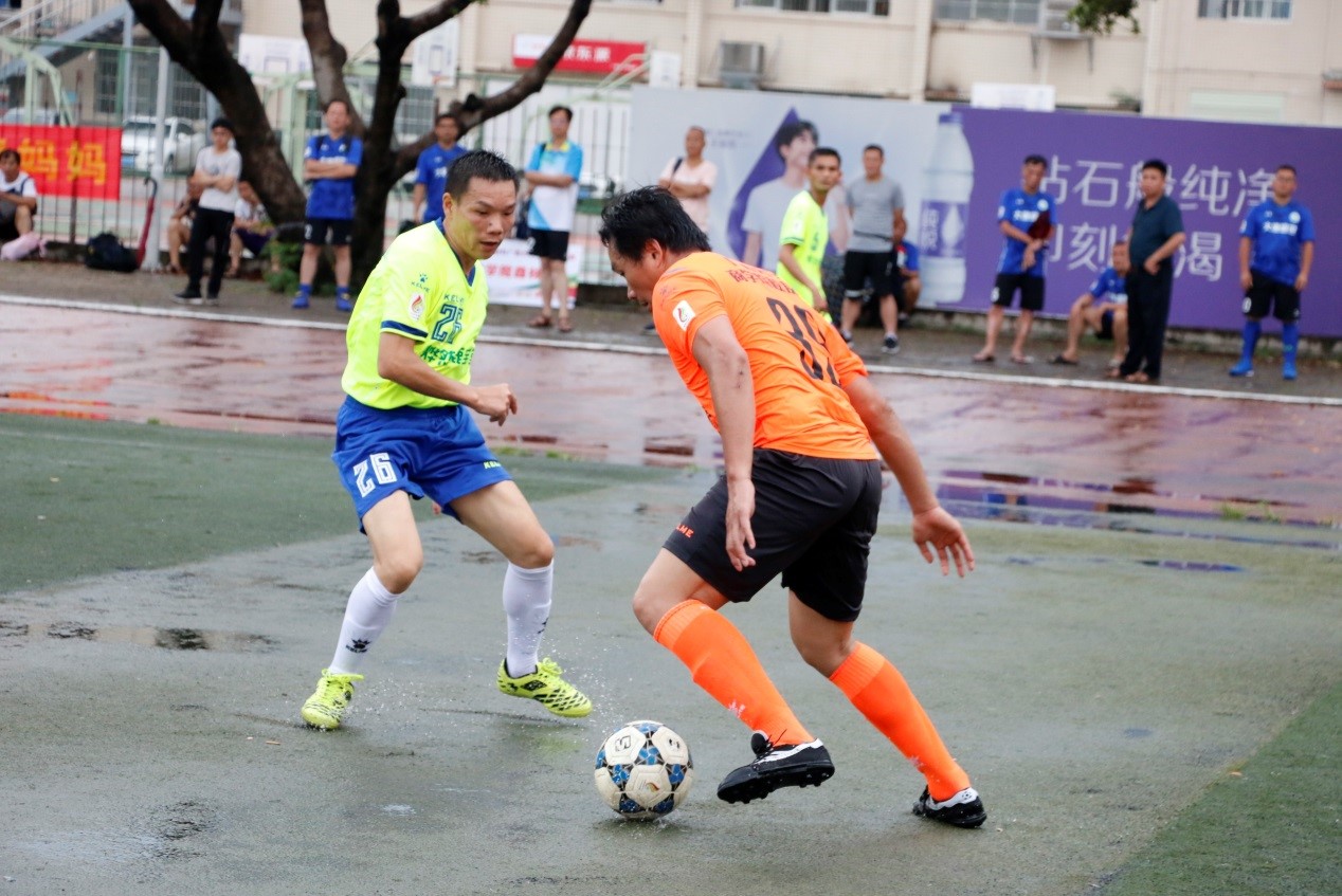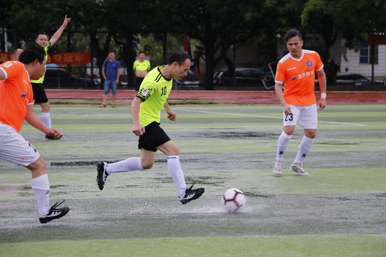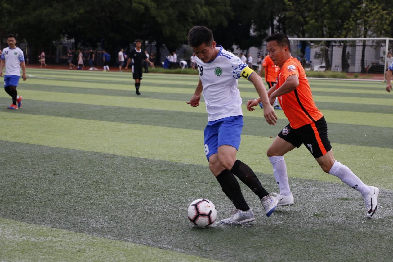 雨过天晴,君武教工和机械学院开始对弈。受雷雨天气影响,场地积水湿滑,但阻挡不住球员们想要一决高下的激情。上班时刚开场两队都力求稳扎稳打,不轻易压上,直至比赛的第36分钟,君武教工获得点球,12号杨帆大力施射,将球扫如左下角,激烈比赛就此开始。在后半场比赛期间,机械学院队吃下本场比赛的第一个黄牌。随后君武教工队乘胜追击,通过团队传切配合有66号邓勇再入一球,最终君武教工队以2:0战胜机械学院队,拿下首场胜利。