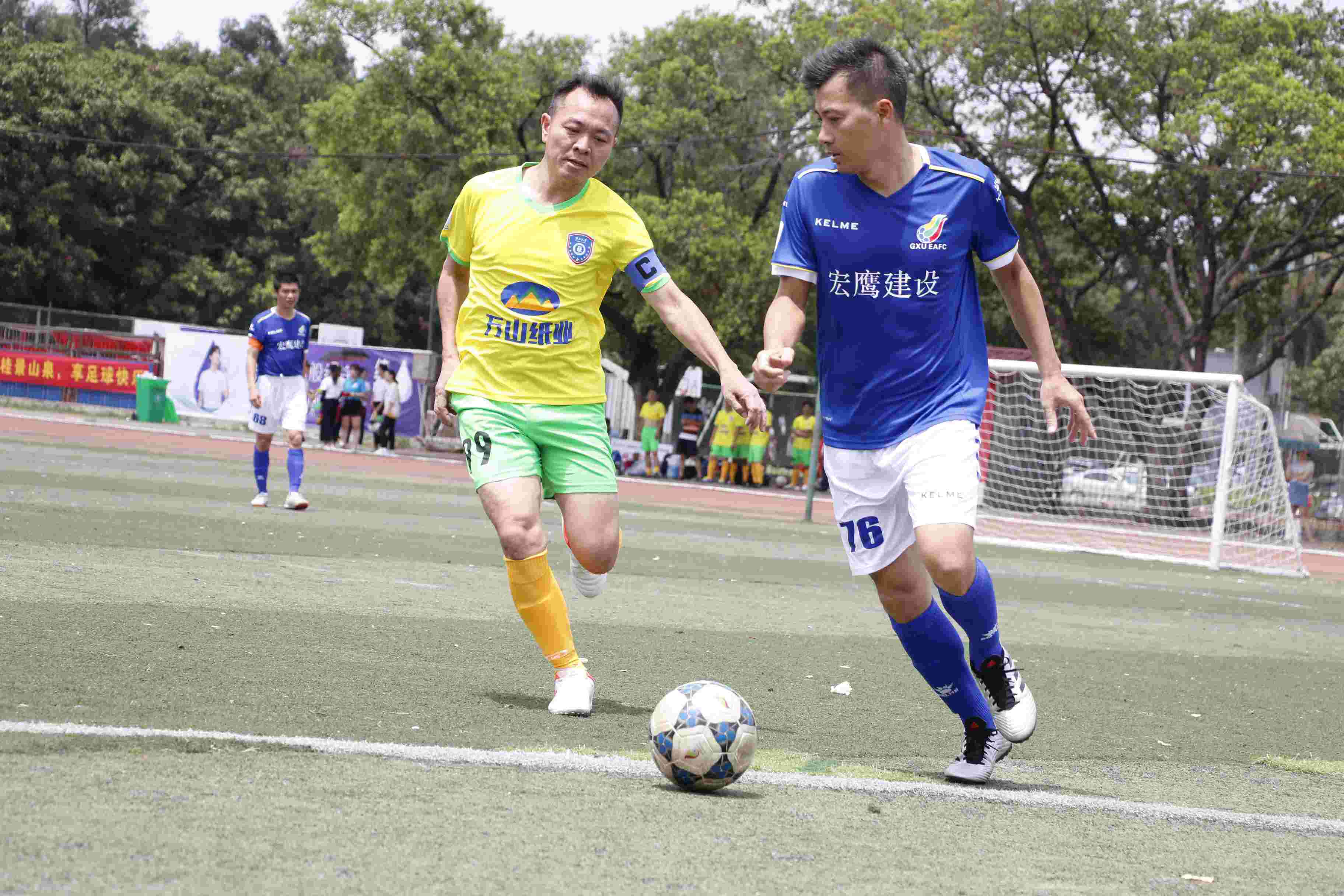 在A45+赛组中,土木老狼VS春茂电气两队的比赛最引人注目。土木、电气乃西大传统豪门,虎狼之师也。这是广西大学过去冠军两大有力争夺者时隔20多年后的再次过招,当年英俊帅气的他们,如今许多人已经两鬓斑白,岁月流逝,时代变迁,足球不老,他们的心态永远不老。双方阵中球星熠熠,均有前校队大牌大腿级球员压阵,此役,双方均志在必得。
