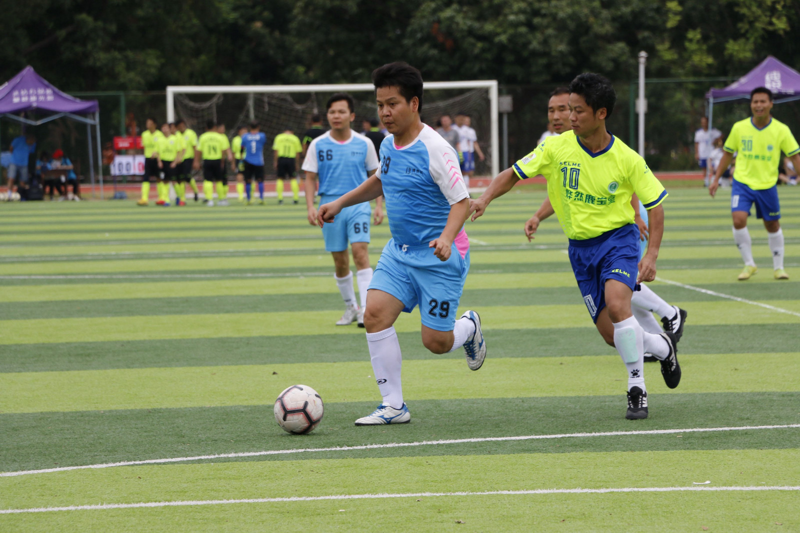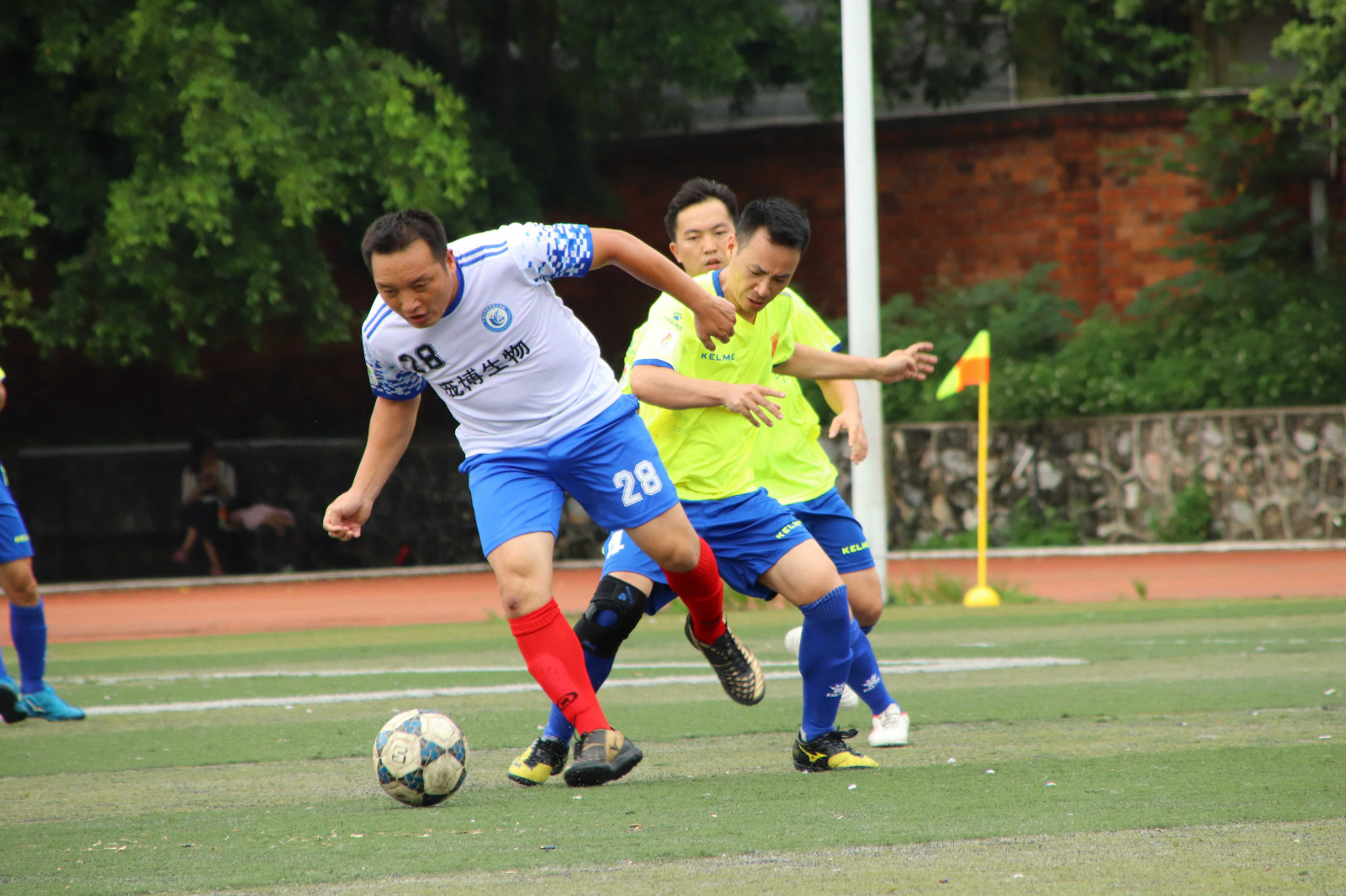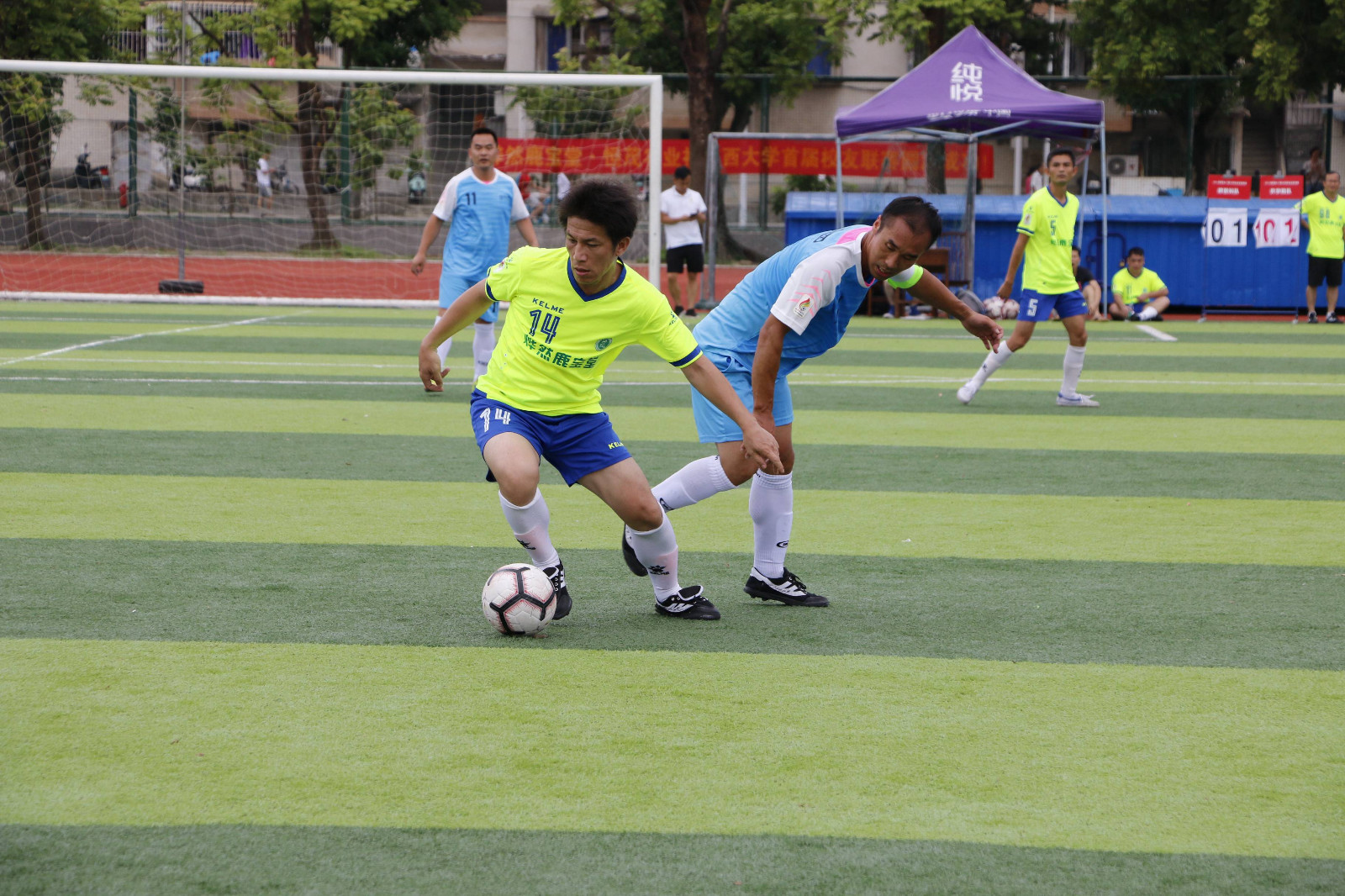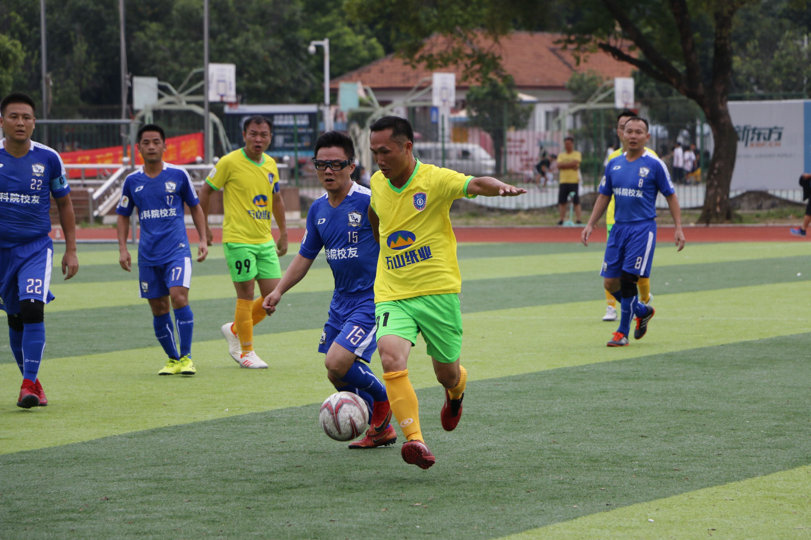 7 月13日上午10时,农院碧云湖队和化院庞博队的比赛在东校园体育场3号场展开。随着裁判的哨声吹响,整个球场就充满了紧张的气氛,球员们的激情全都淋漓尽致地挥洒在此刻的足球场上。比赛攻防节奏转换非常快,双方你往我来, 僵持不下。开场36分钟, 农院碧云湖队5号吴军华踢进一球打破场上僵局。 但化院庞博队并没有气馁,经过系列调整后进行大局反击,造成了多次有威胁的进攻,但是运气不佳,屡次被对方守门员和后卫化解。最终比分定格为 1:0,农院碧云湖队获得首胜。两队也携手奉献了一场极为精彩的对决。