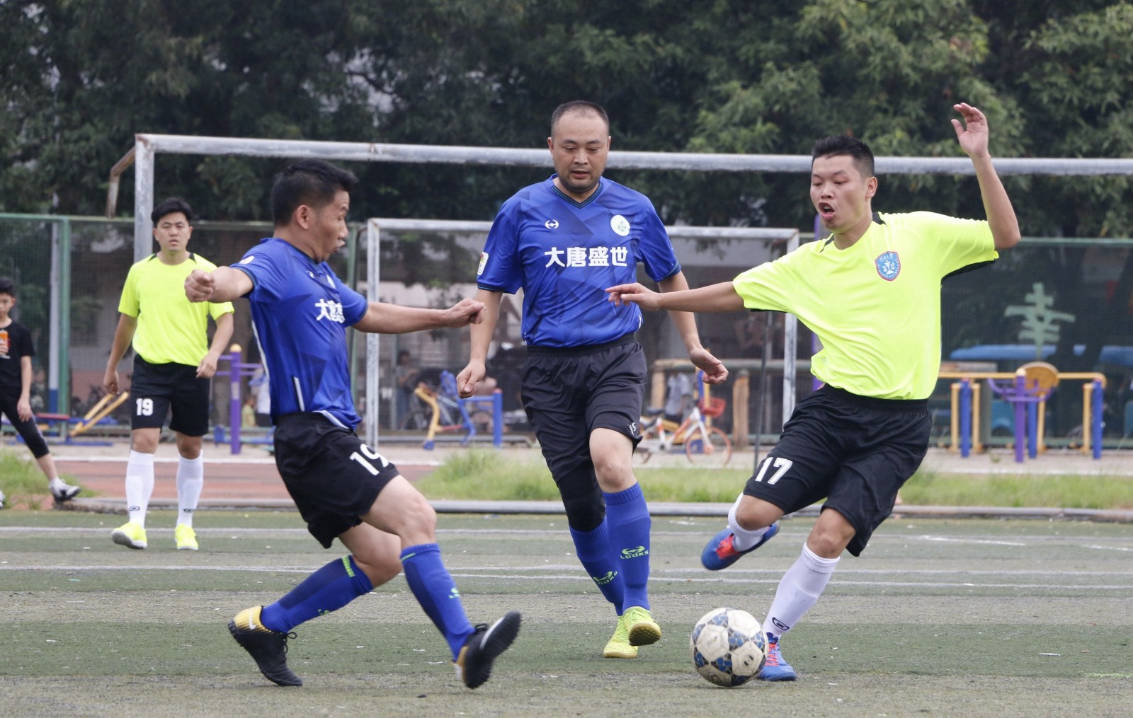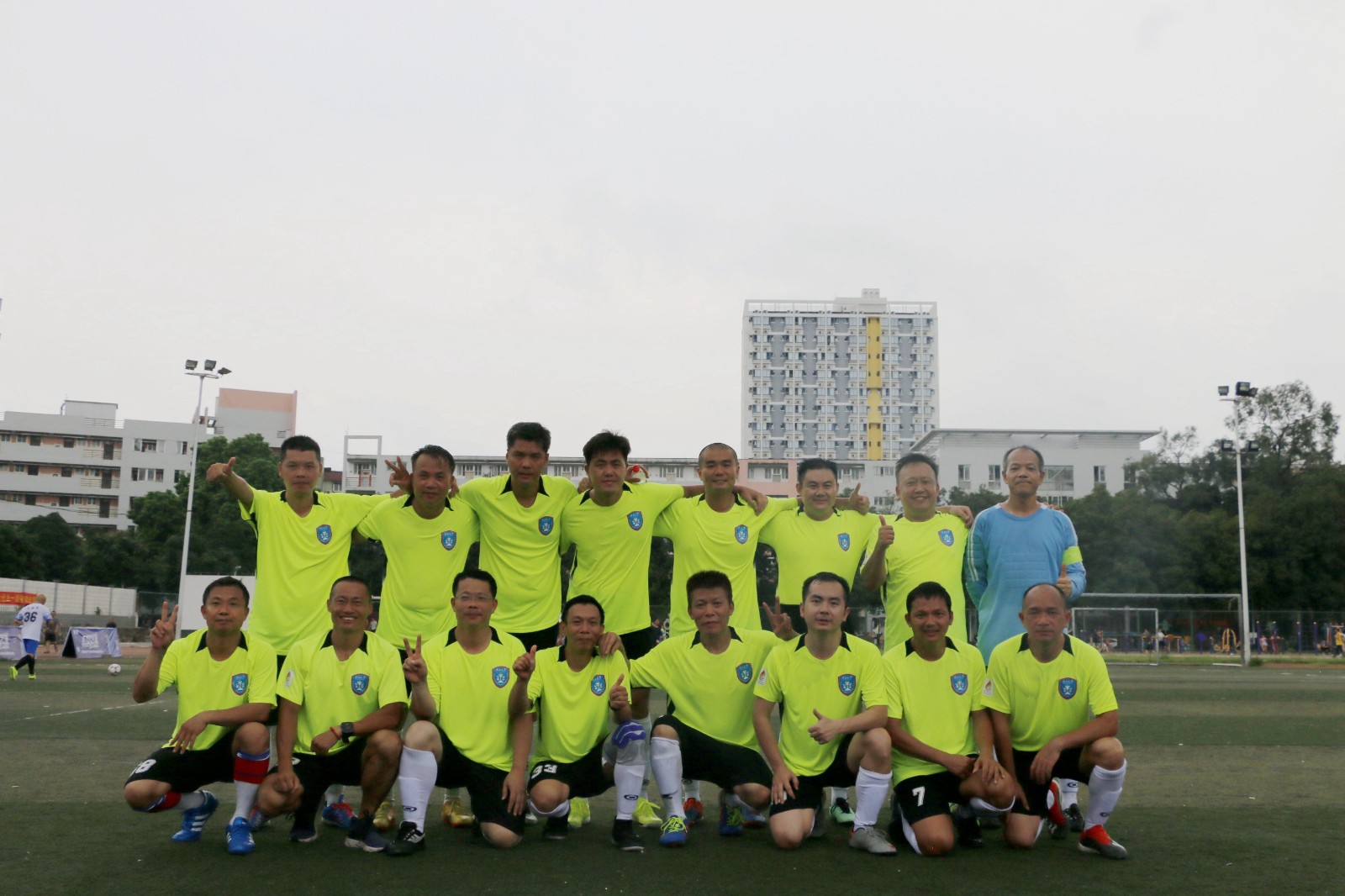 法学院更多是后场长传找前锋,利用边路速度优势打英超式反击战略,也觅得几次良机。赛至30分钟,原西大校队队长也是11号球员尽管年近5旬,依然习惯使用20多年前的假动作,利用此在左路得以摆脱对方后卫,手术刀般横传,使球越过林学院星鹰二名后卫身后,同时右路68号心领神会,拍马赶到,观察守门员站位后打远角可惜偏门而出,浪费一次单刀赴会扩大比分的良机。下半场法学院33号和7号球员也因对手紧逼的防守,多次与进球失之交臂。