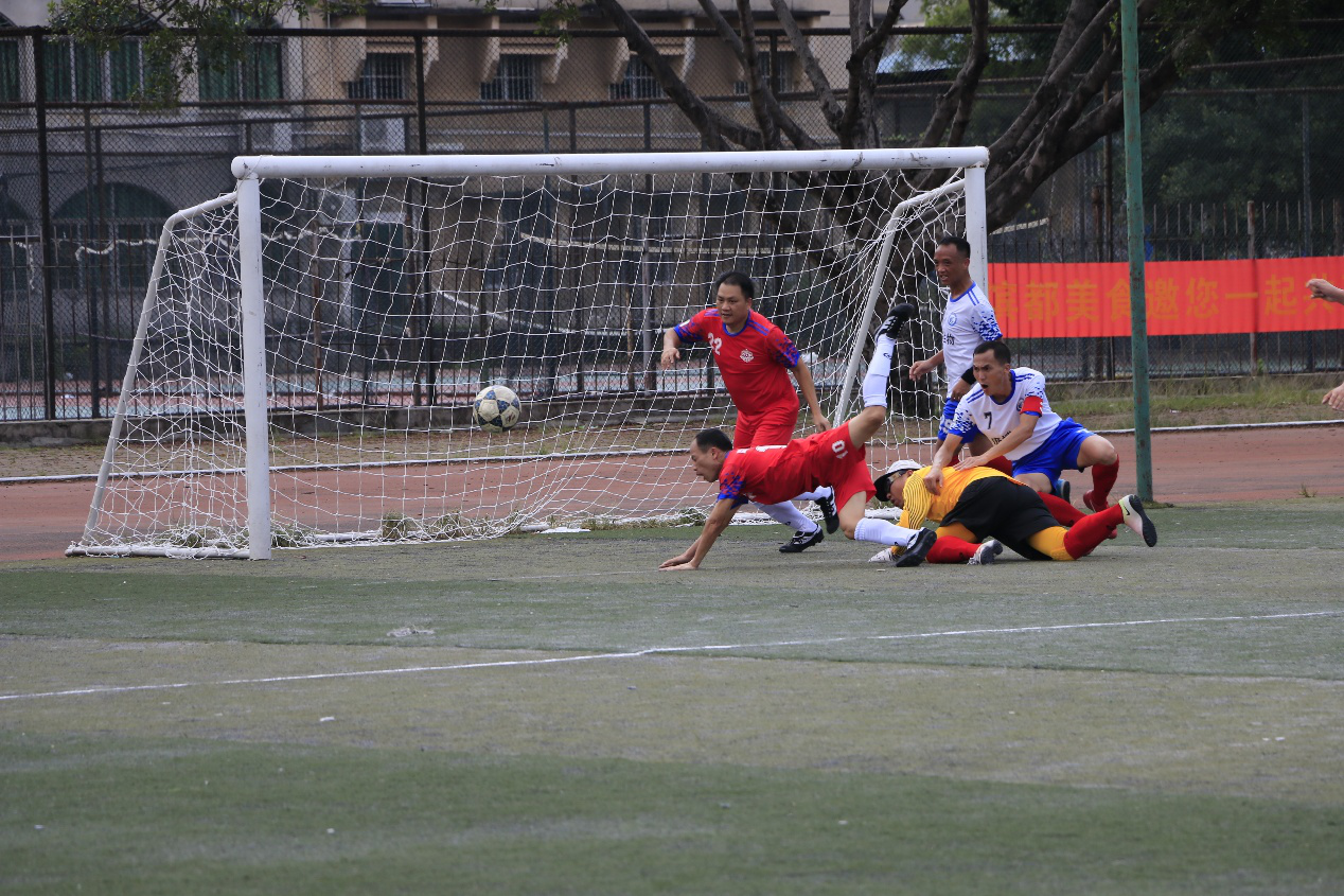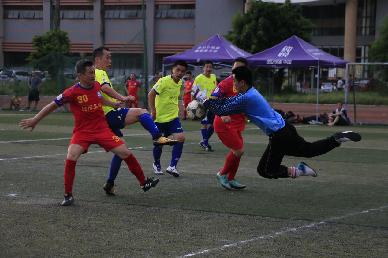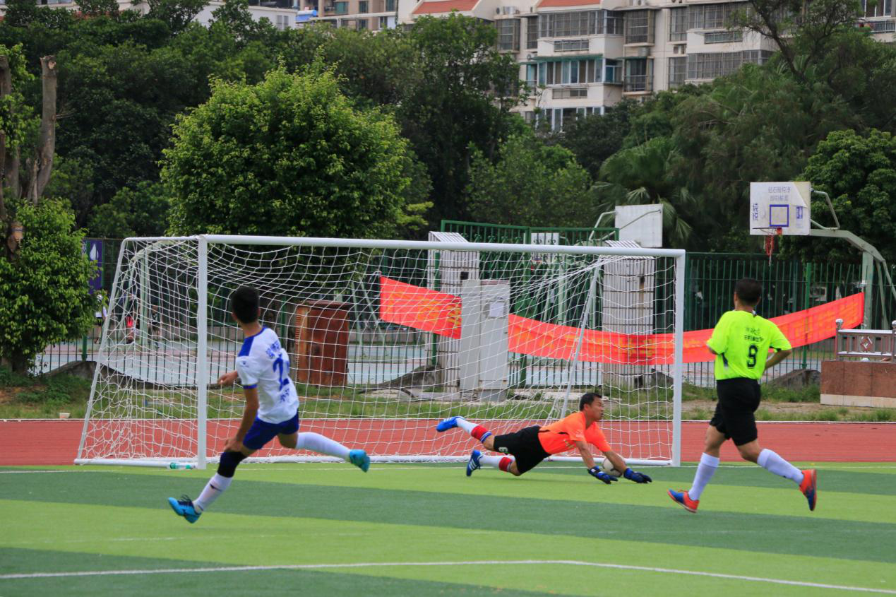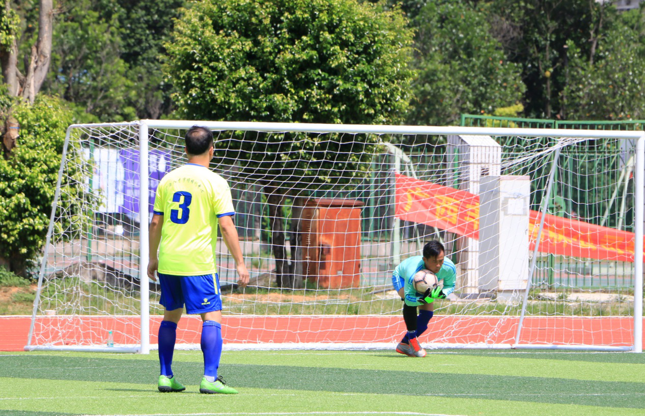 两队抢夺十分激烈,多次在对方门前展开你来我往的进攻。在第25分钟,君武教工边界球开出,传至中场遭对方多人拦截,12号杨帆在人群中巧妙夺球并大力抽射,被化院庞博门将杨洪波胸前扑球拦下。第39分钟,化院庞博87号唐运强抓住机会,晃开角度斜射入网,为化院庞博拿下一分的领先,上半场比分为1:0。