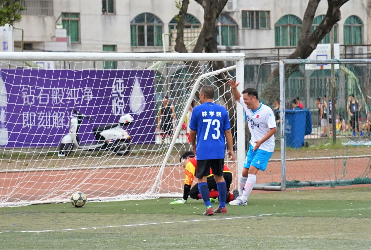 第13分钟,法学院19号高恒形成单刀,在对方禁区内辗转,紧接着斜传给29号李敏锦,守门员出击但没有碰到足球,李敏锦顺势射门入网,1-0!在激烈的进攻防守中,外国学院队也不甘示弱,第25分钟, 20号梁畅程打入一球,将比分扳平。
