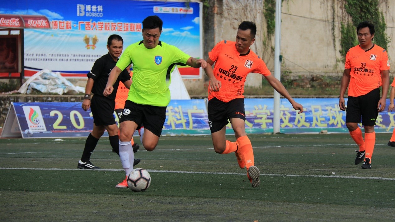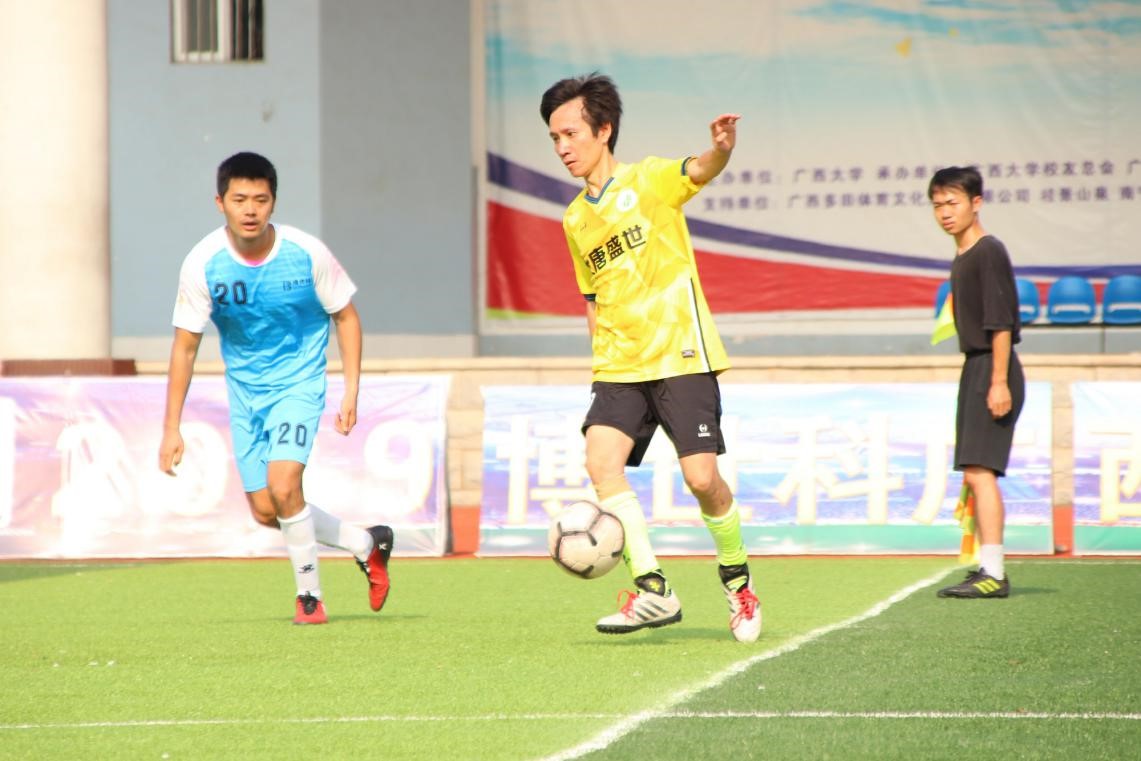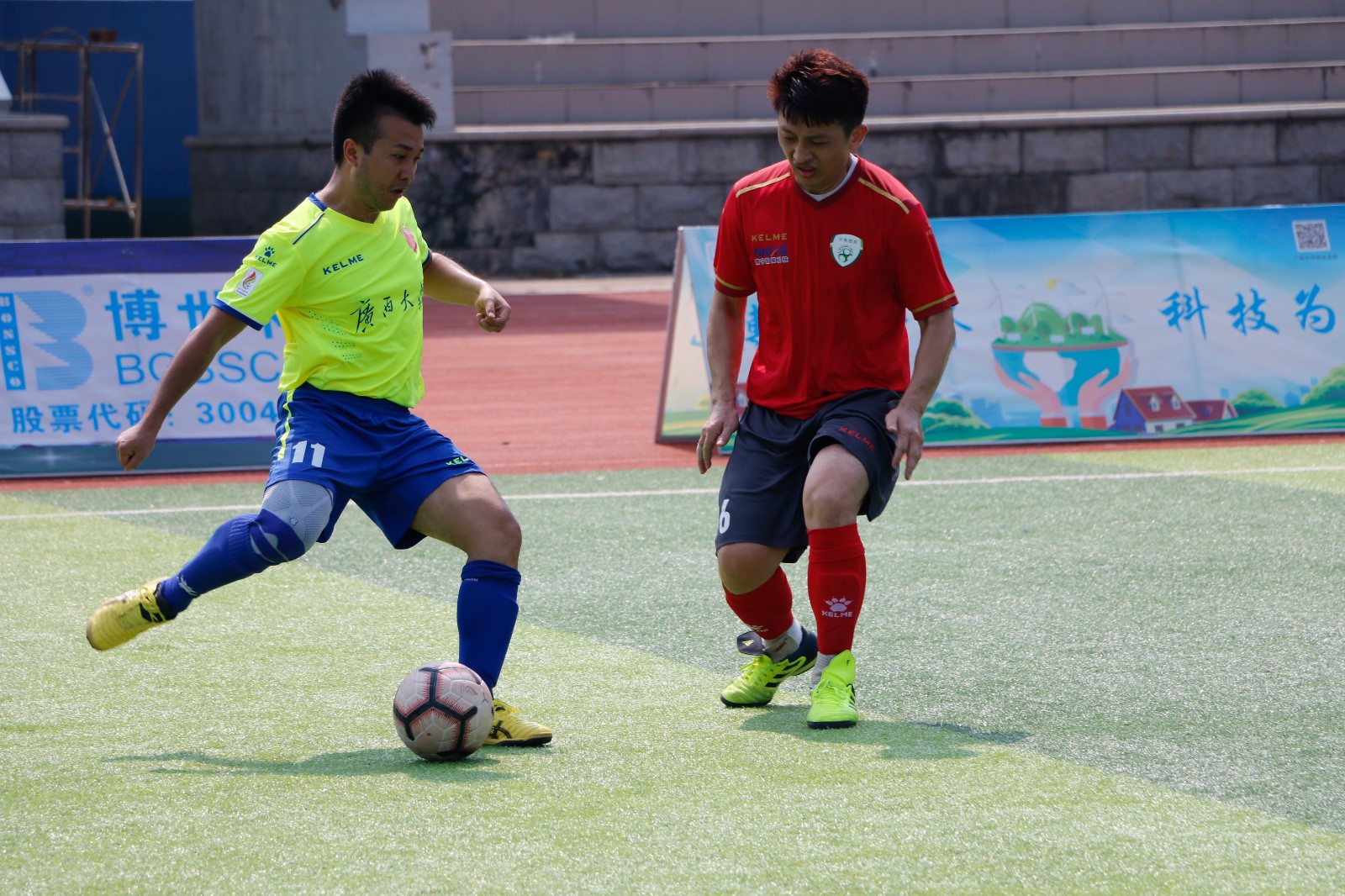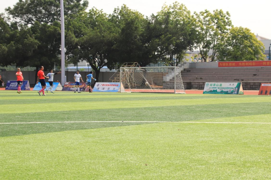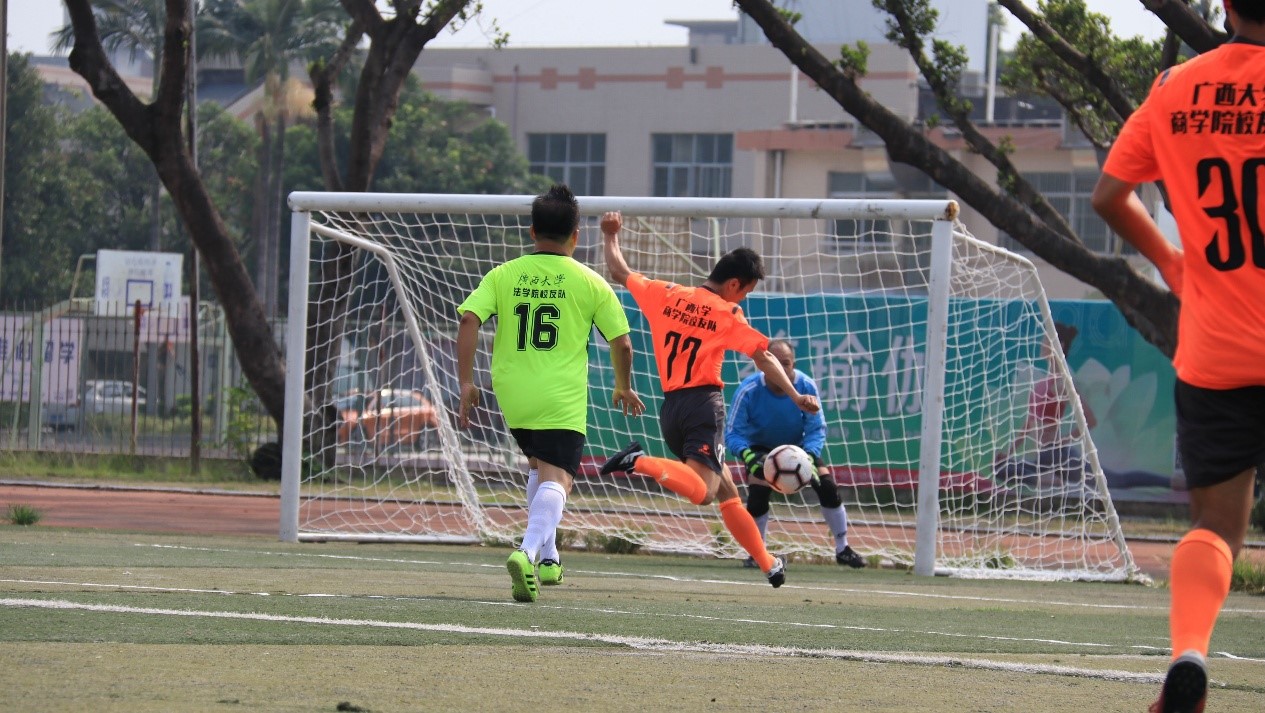 相较于上午和午后,傍晚的天气无疑更为舒适。比赛伊始,双方很快进入状态,但由于双方实力相当,前20分钟都没有发生进球。在第21分钟, 君武教工57号黄东威在对方禁区犯规,农院碧云湖队获得一个点球的机会,但他们的点球被君武教工门将给挡住了。2分钟后, 君武教工队9号苏北成在对方双人防守的情况下,旋转身位,率先射入一球。农院碧云湖队也不甘落后,在 第34分钟时,15号王强角球传给9号刘家康,刘家康一个头球,把球射入君武教工门内。上半场1:1结束。