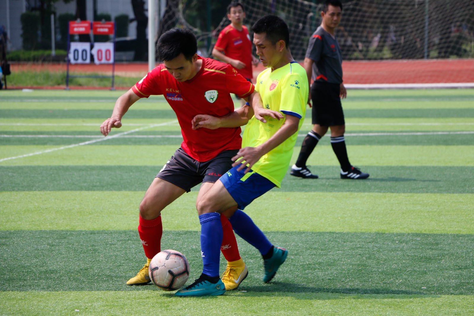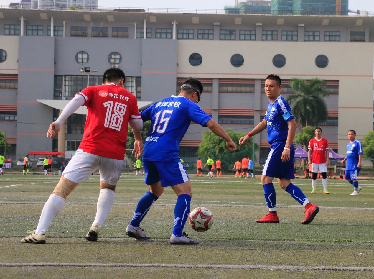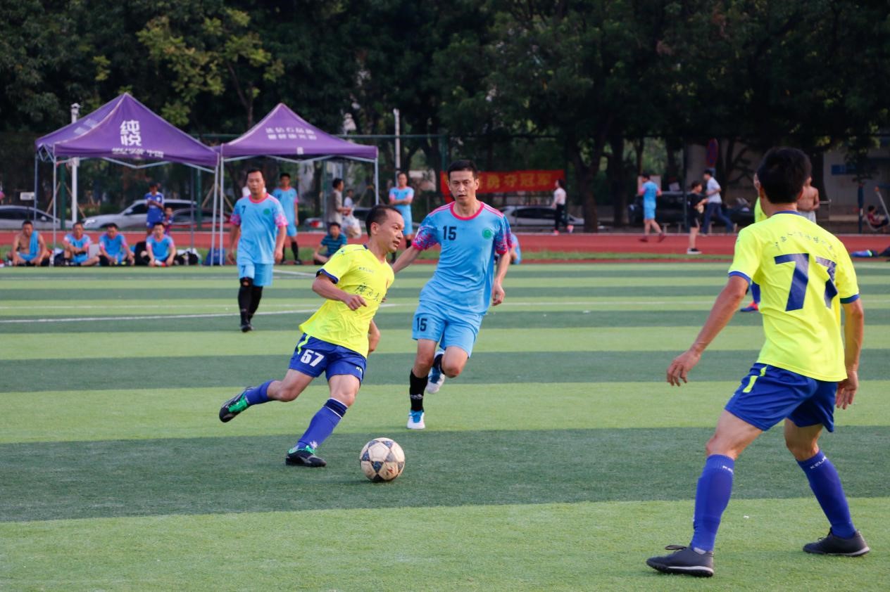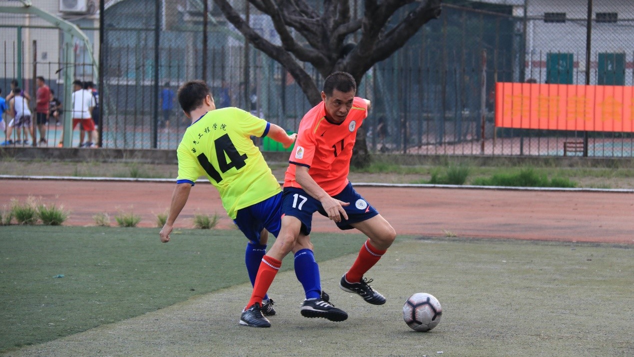 相较于上午和午后,傍晚的天气无疑更为舒适。比赛伊始,双方很快进入状态,但由于双方实力相当,前20分钟都没有发生进球。在第21分钟, 君武教工57号黄东威在对方禁区犯规,农院碧云湖队获得一个点球的机会,但他们的点球被君武教工门将给挡住了。2分钟后, 君武教工队9号苏北成在对方双人防守的情况下,旋转身位,率先射入一球。农院碧云湖队也不甘落后,在 第34分钟时,15号王强角球传给9号刘家康,刘家康一个头球,把球射入君武教工门内。上半场1:1结束。