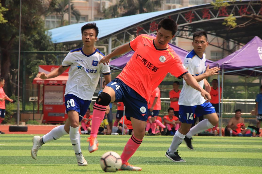 烈日炎炎, 正路机械与外语学院对抗赛在西校园2号场拉开序幕。双方一开场就展开攻势,比赛开场10分钟, 正路机械96号黎培杰吃下比赛第一张黄牌。第16分钟, 外语学院7号肖克宁率先突破禁区拿下一个空门球,场上比分0-1。正路机械加强进攻,第22分钟, 正路机械10号黄家群形成单刀射门得分,场上比分1-1暂平。第33分钟, 外语学院16号刘长尧吃下黄牌一张。第37分钟, 正路机械8号冯建成接过队友传球低射入网,上半场比分正路机械2-1外语学院领先。