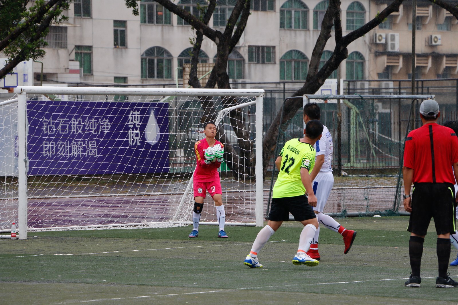 上午10 时,法学院主场对阵教工宝骏。比赛一开始,教工宝骏接连发起攻势。第 4 分钟, 21 号余云宇 大禁区前接队友直传,晃开角度右脚捅射,皮球直进大门右下角,教工宝骏1-0 领先。第 6 分钟,法学院组织长传,前场队员中路大力抽射,足球飞出门框。第 30 分钟,法学院 25 号禁区弧顶劲射,皮球高出横梁。