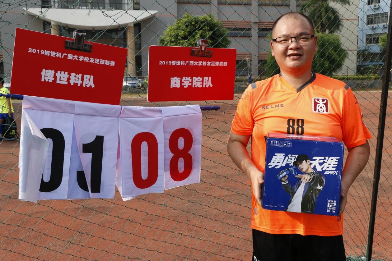 在博世科与商学院的对决中,商学院8:1战胜博士科。 商学院88号朱云松获得本场最佳球员,他认为此次大比分获胜的原因有三,首先是团队很团结, 心往一处想,力往一处使,打好每一场比赛;其次是克服了主力球员受伤的困难,三是配合默契,由于后卫和中场的超常发挥,使前锋无后顾之忧,才使得这场比赛大比分胜利。