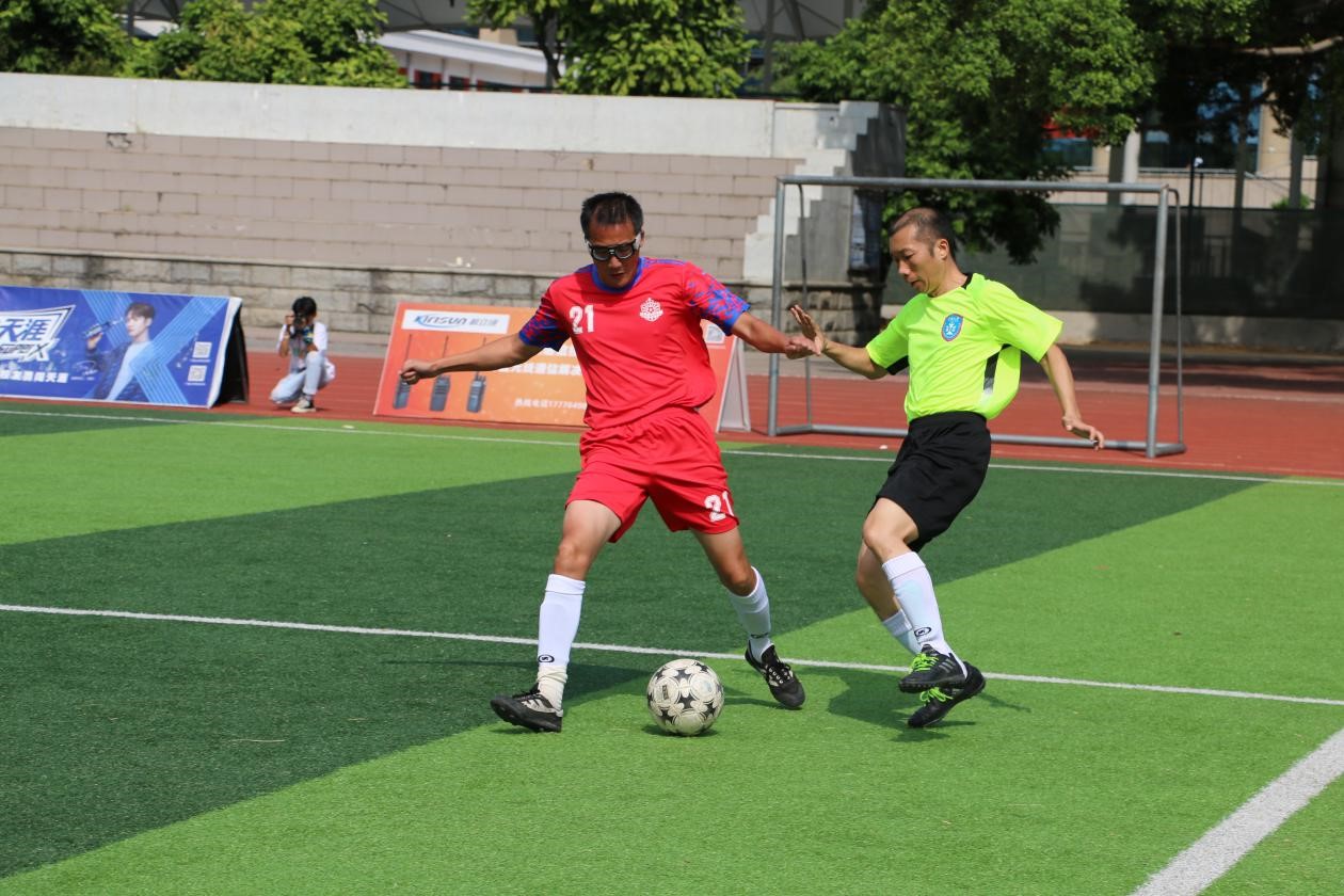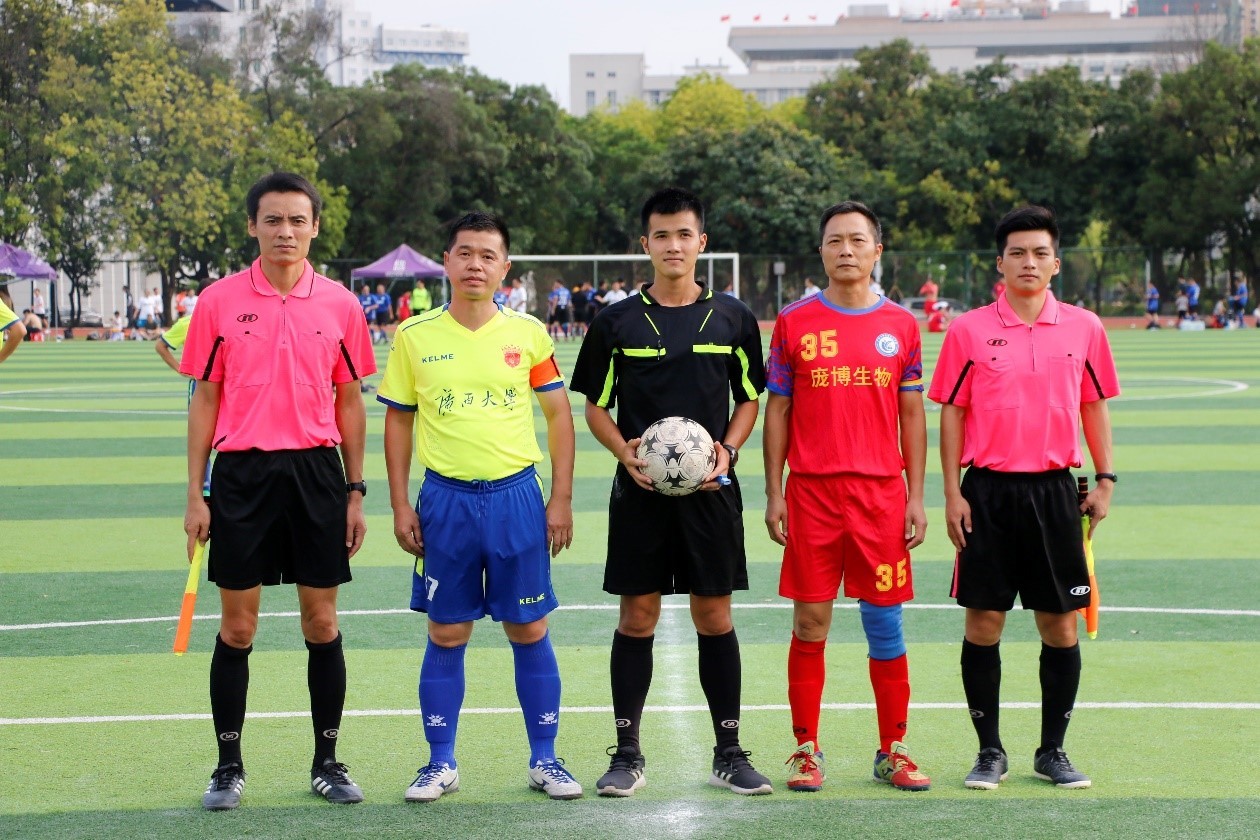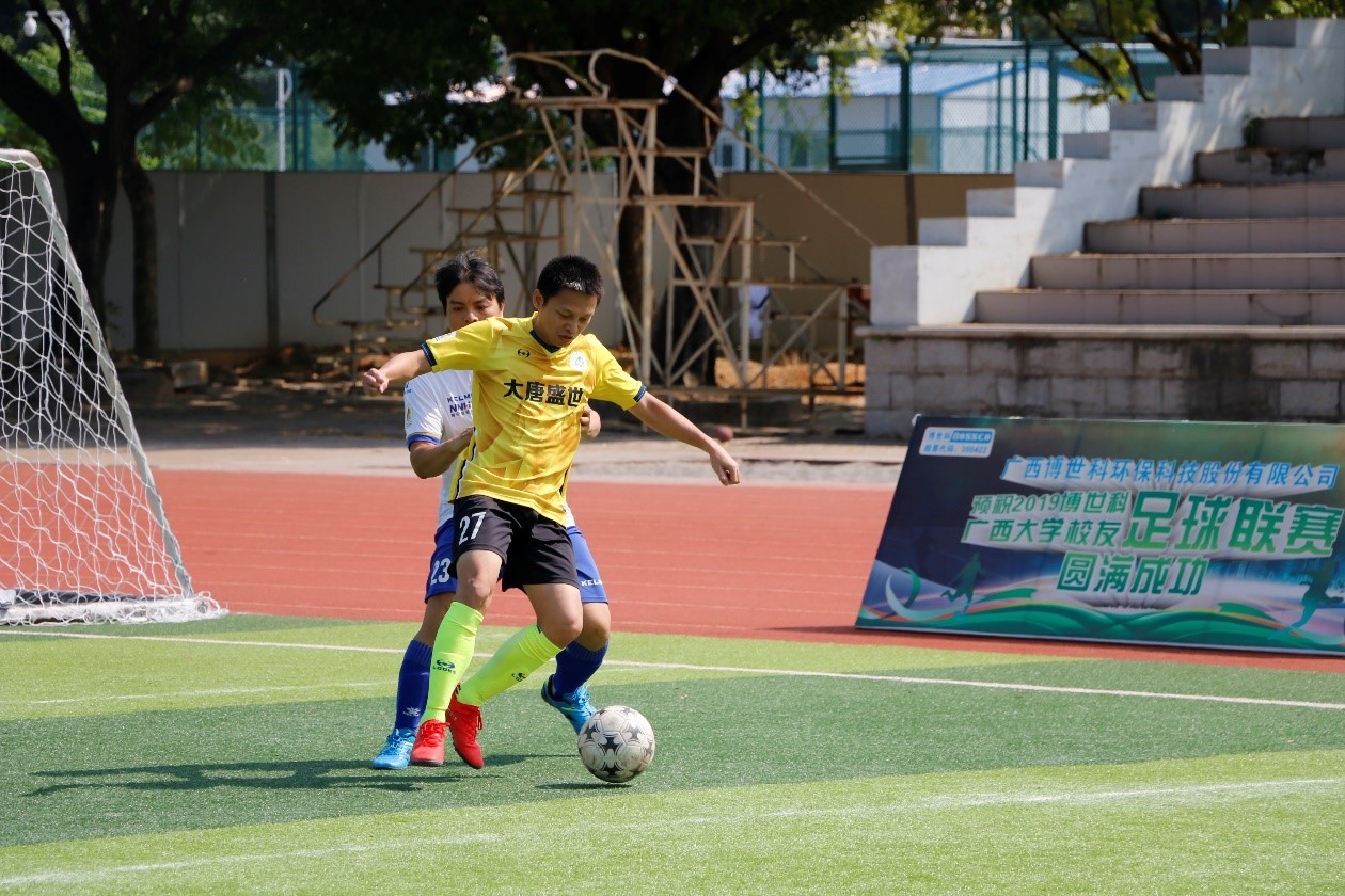 9 月21日上午10:14分,2019博世科广西大学首届校友足球联赛第12轮比赛在灿烂阳光中如期鸣哨。西体1号场进行的是商学院队与轻工万山的比赛。