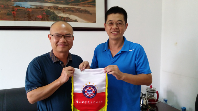 2016年8月19日,校友足球协会秘书长祝云造访广西大学校友总会,向校友工作办公室新任主任 李高南汇报校友足球协会工作,以及协会近期赴北海、贵港交流 比赛的筹备情况。