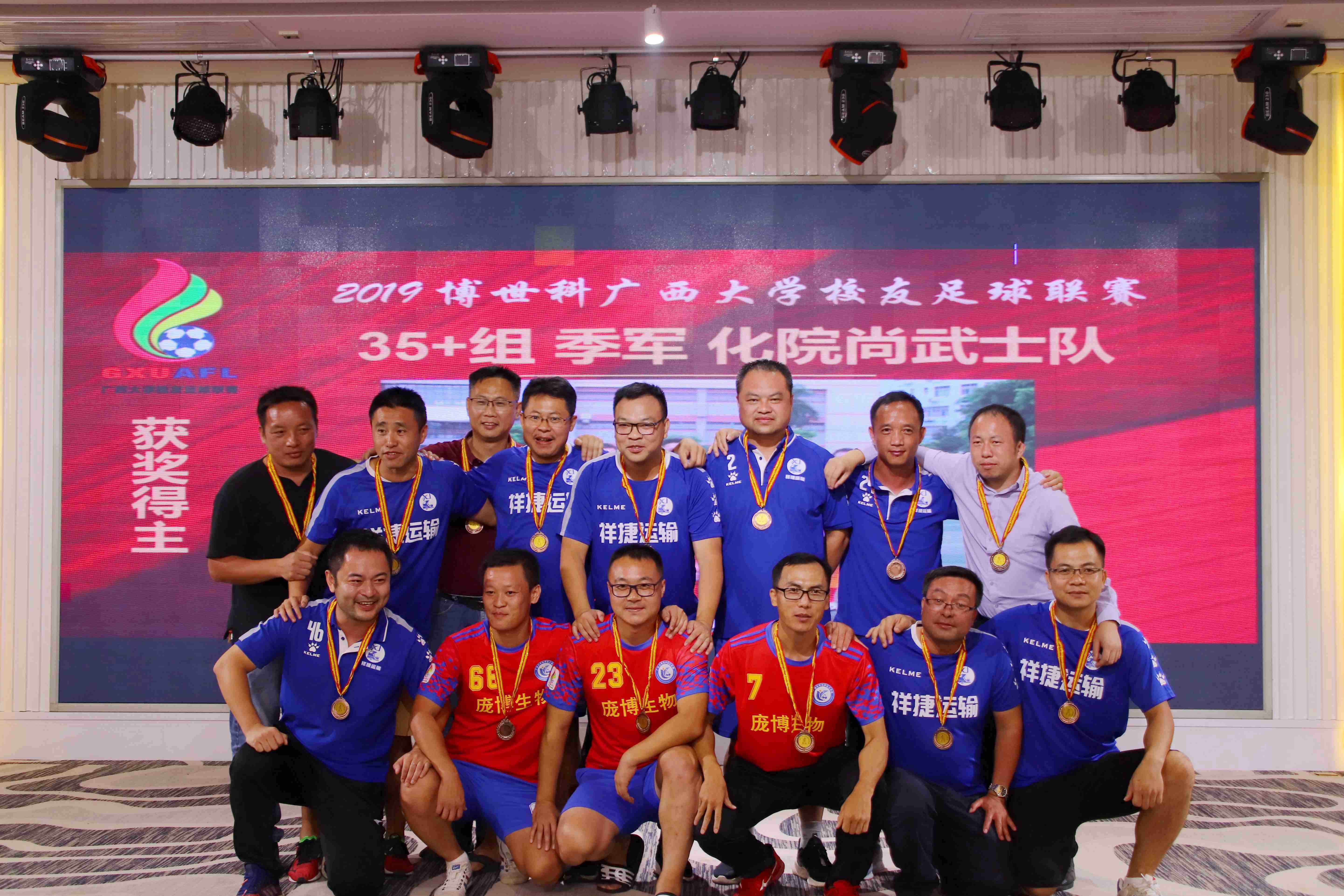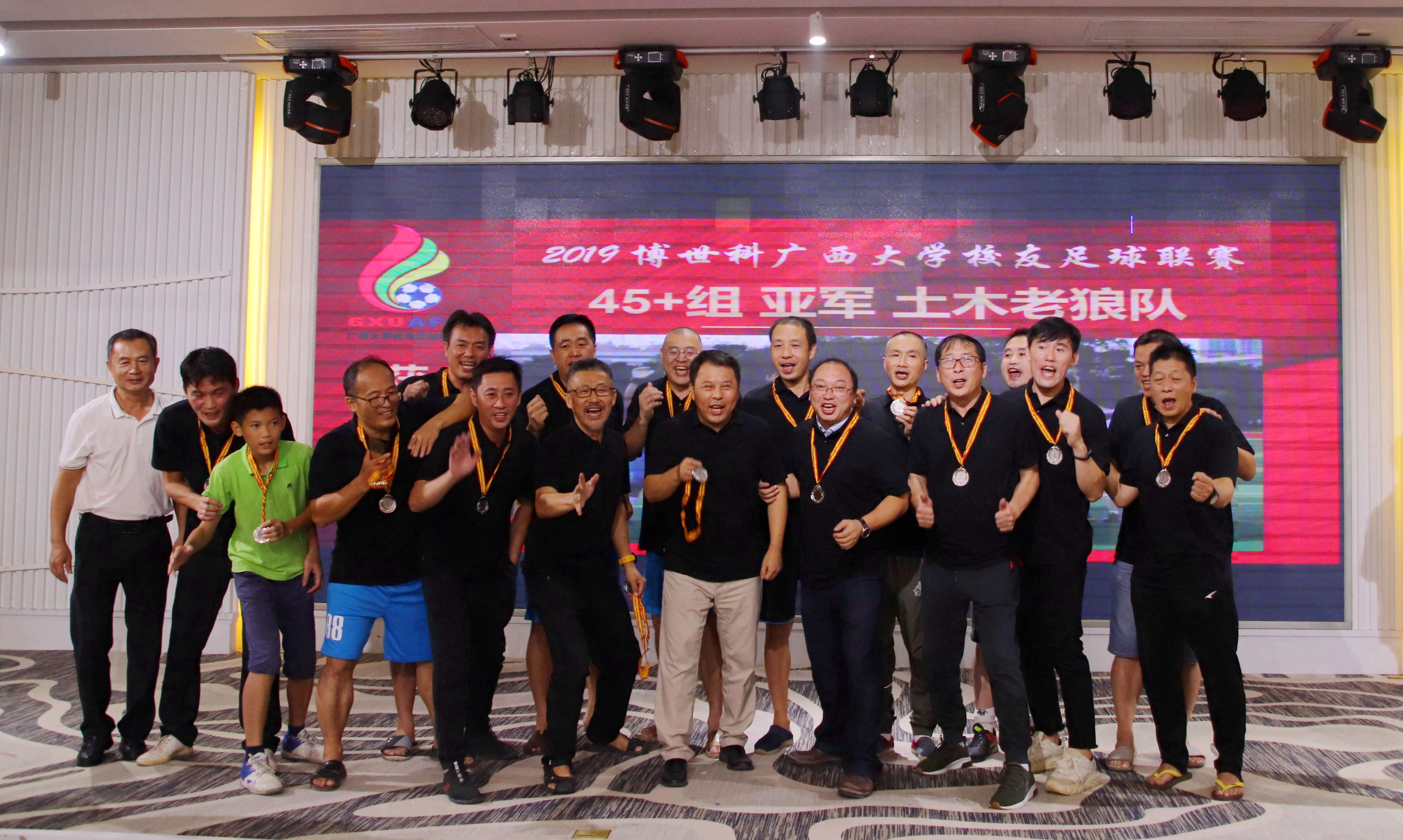 经过三个多月的鏖战,2019博世科广西大学首届校友足球联赛10月19日圆满落幕,春茂电气队和商学院队分别夺得45+、35+年龄组冠军。在上周六晚举行的闭幕颁奖式上,广西大学副校长马少健、自治区科技厅副厅长钱健、广西体专党委书记周璋斌等领导嘉宾出席活动并为冠亚季军球队颁奖,校友总会、校友足协、各学院相关负责人与参赛的校友运动员共500多人参加闭幕颁奖活动。