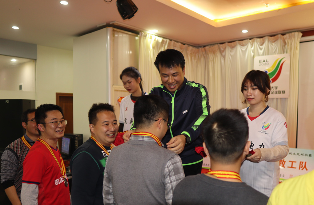 有的人,见与不见,皆在心中;有的球,踢或不踢,有酒必干!这,就是电气足球人的情怀。逐电风行绿茵场,共忆西大校友情!这,就是电气足球的传承。在来宾市宾盛电力工程有限公司的鼎力支持下,2020“宾盛杯”电气校友足球联赛成功举办。12月26日19:00,简单而隆重的闭幕颁奖典礼在南宁市邹圩鱼酒楼举行,广西大学校友办主任余云宇、电气工程学院党委书记梁京章等十余位领导、嘉宾莅临。