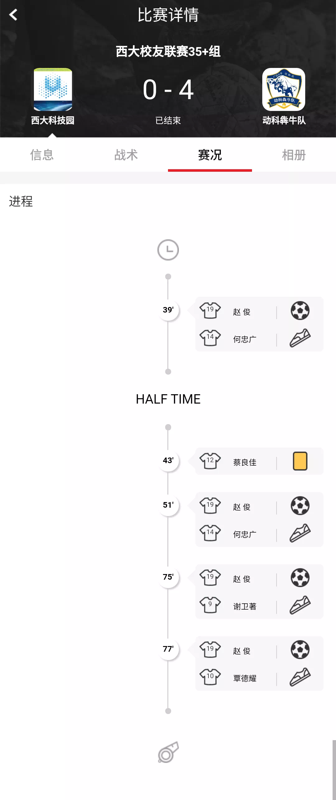 开局双方都做了几次试探性的进攻热热身,没有对球门造成太大威胁。第39分钟时动科首先打破僵局,由14号何中广助攻19号赵俊打入本场第一粒进球。第43分钟时动科队12号蔡良佳被罚黄牌。下半场动科队乘胜追击,第51分钟时14号何中广助攻19号赵俊梅开二度。第75分钟时9号谢卫著助攻19号赵俊上演帽子戏法。第77分钟时10号覃德耀助攻19号赵俊又进一球完成大四喜锁定胜局。
