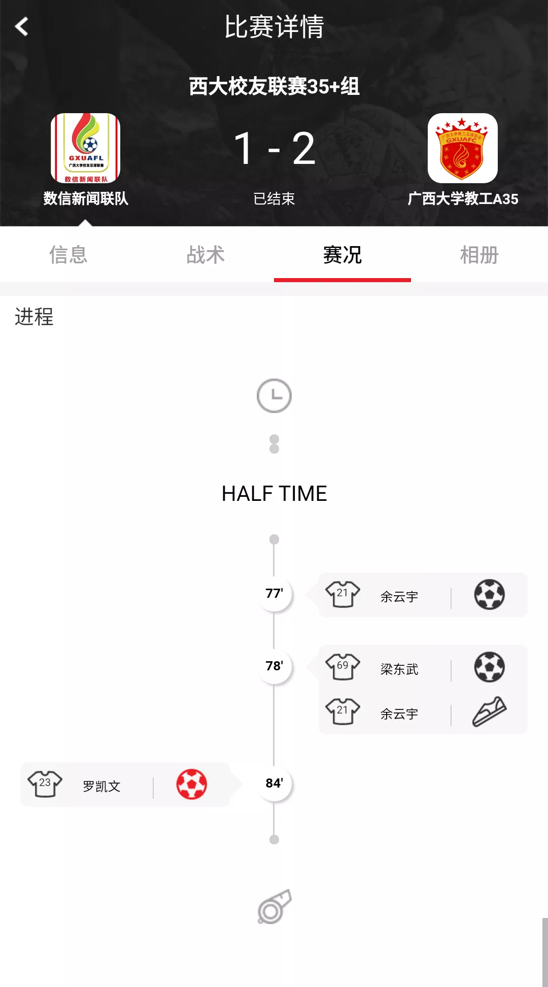 11:41 比赛哨声响起,比赛结束,教工2:1数信新闻联队获得胜利,21号余云宇凭借优异的表现荣获MVP。
