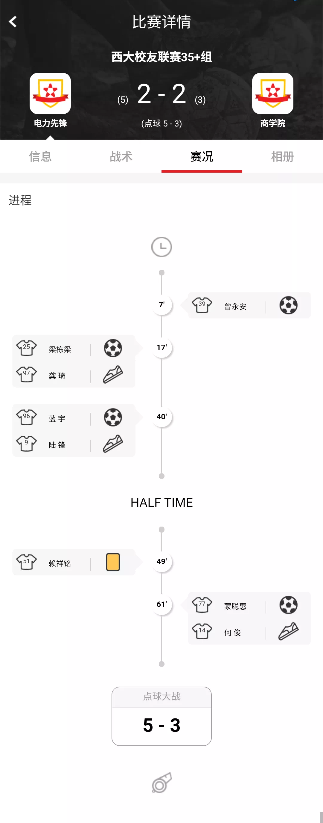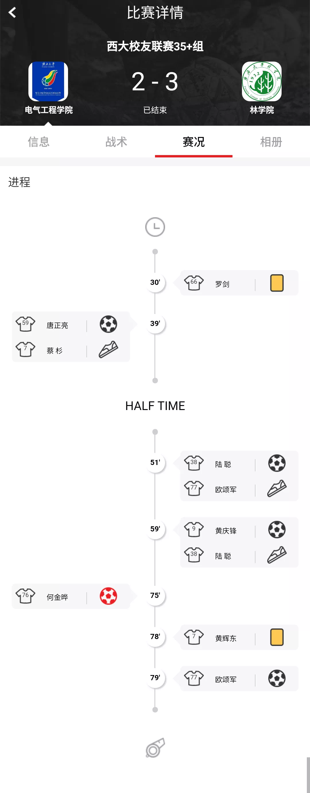上半场一开局,双方就踢得火热,第30分钟林学66号罗剑黄被罚黄牌。紧接着第39分钟电气队先夺一分,由7号蔡杉助攻59号唐正亮打进一球。