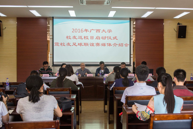 2016年11月3日下午,广西大学校友返校日启动仪式暨校友足球联谊赛媒体介绍会在广西大学办公北楼会议厅召开。校友返校日活动由广西大学校友总会、广西大学校友工作办公室主办,广西大学校友足球协会、广西大学体育学院承办。