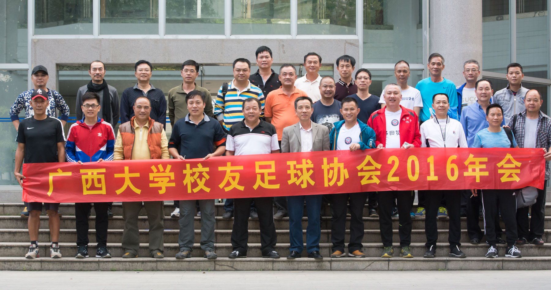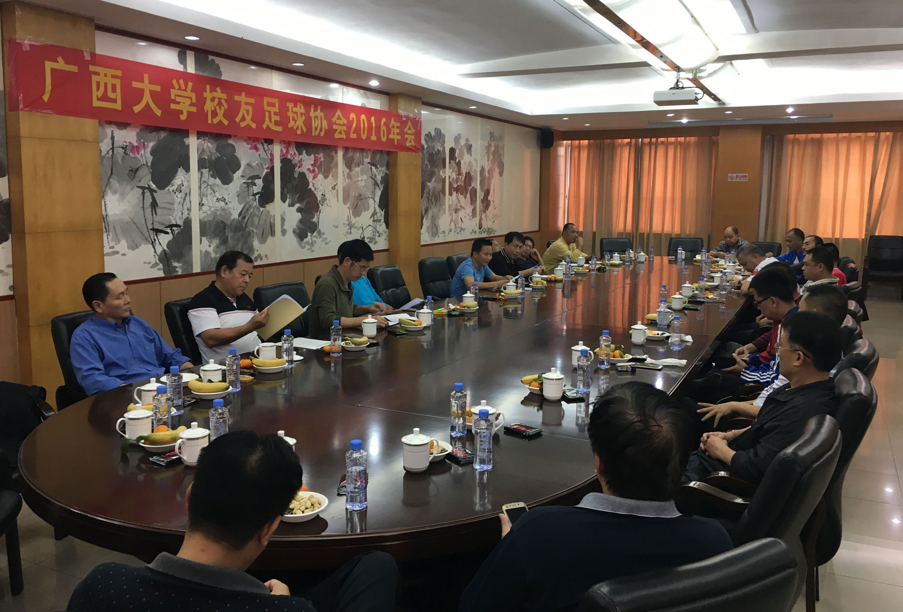 下午 14:30,广西大学校友足球协会 2016 年年会在广西大学君武馆第一会议室举行,广西大学校友总会常务理事、校友足球协会名誉会长黄建平向大会传达了广西大学 2016 年常务理事(扩大)会议精神,号召全体会员集思广益,为母校 90 周年校庆做贡献。
