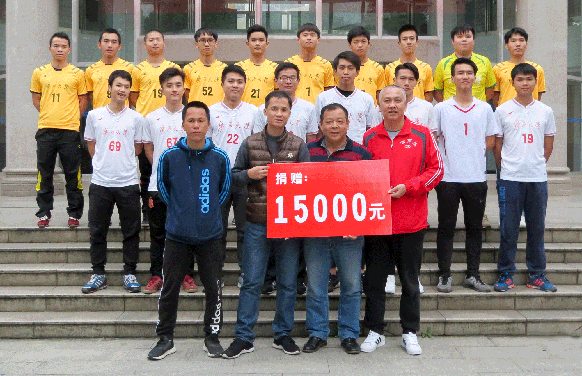 仪式上队长杜伟文向广西大学足球队赠送由多田贸易赞助的服装,黄建平会长代表广西大学校友足球协会,将广西第二安装公司和文建农业有限公司捐赠的款项交给广西大学足球队。黄建平会长指出,西大校友们积极支持学校建设,积极开展校企合作。校友们有钱出钱,有力出力,这次为西大足球队出征助威共组织了 2.2 万元的钱物,一片诚心向母校,一腔热忱为足球。校友足协还将与体育学院共建广西大学高水平足球队,并以此为目标不断奋斗。