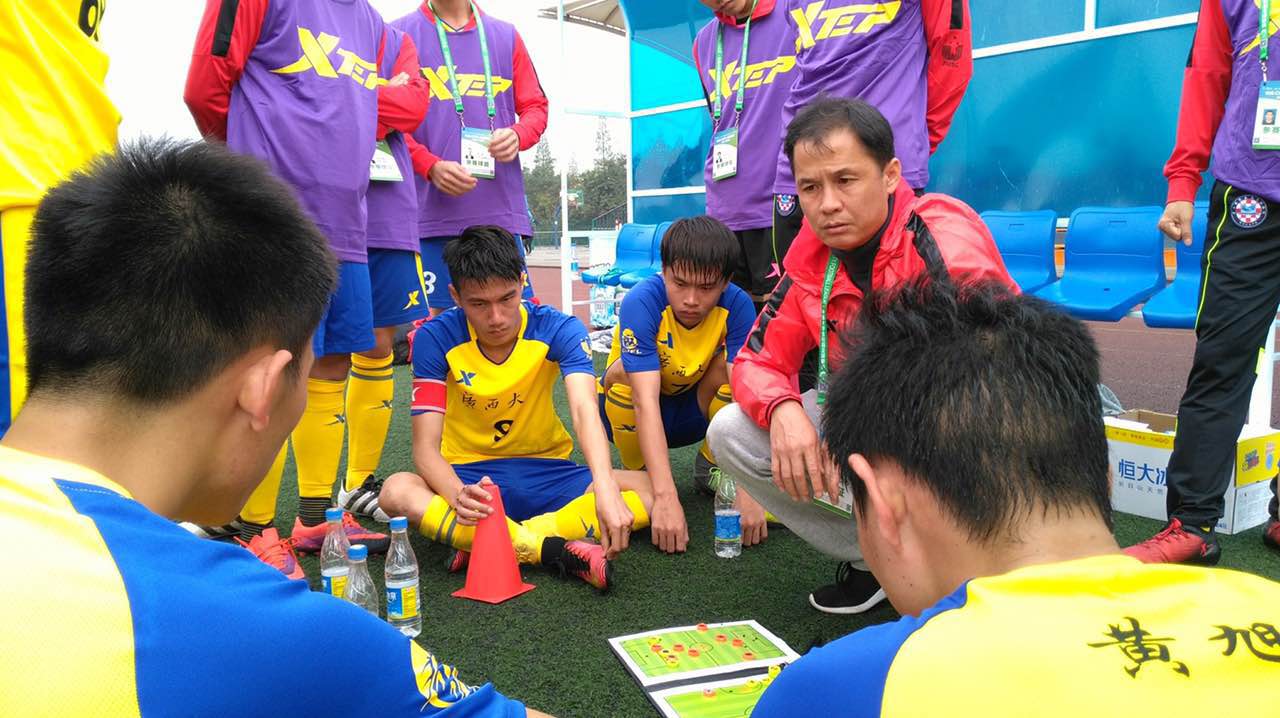 (广西大学足球队 vs. 中南财经政法大学足球队 教练在进行战术安排)