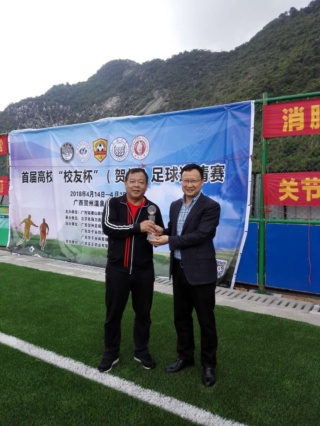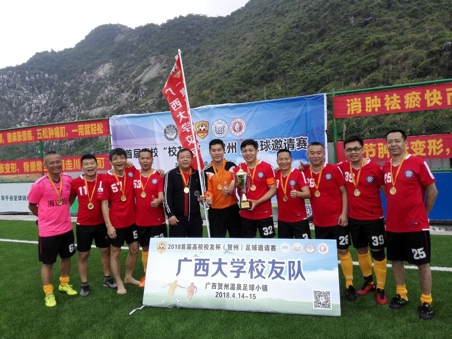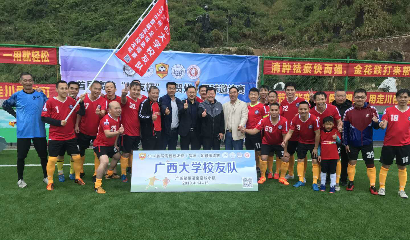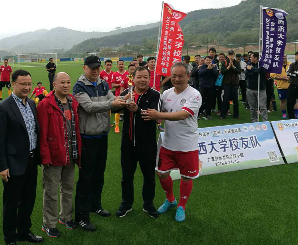 2018 年 4 月 15 日上午,首届高校“校友杯”足球邀请赛复赛,在广西贺州温泉足球小镇隆重举行,凭借着莫飞、张志强、朱定民、毛政等队员的出色发挥和全队团结拼搏,广西大学校友足球队荣获冠军,这是西大校友足协在母校 9 0 周年校庆年夺得的第一个冠军。